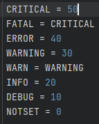 그럼 로그의 기본적인 형태를 알아보자. 로그는 기본적으로 다섯 단계로 나뉜다. 각 단계는 DEBUG, INFO, WARN, ERROR, CRITICAL의 5단계로 이루어지며, 각 단계는 int값으로 레벨이 결정된다.